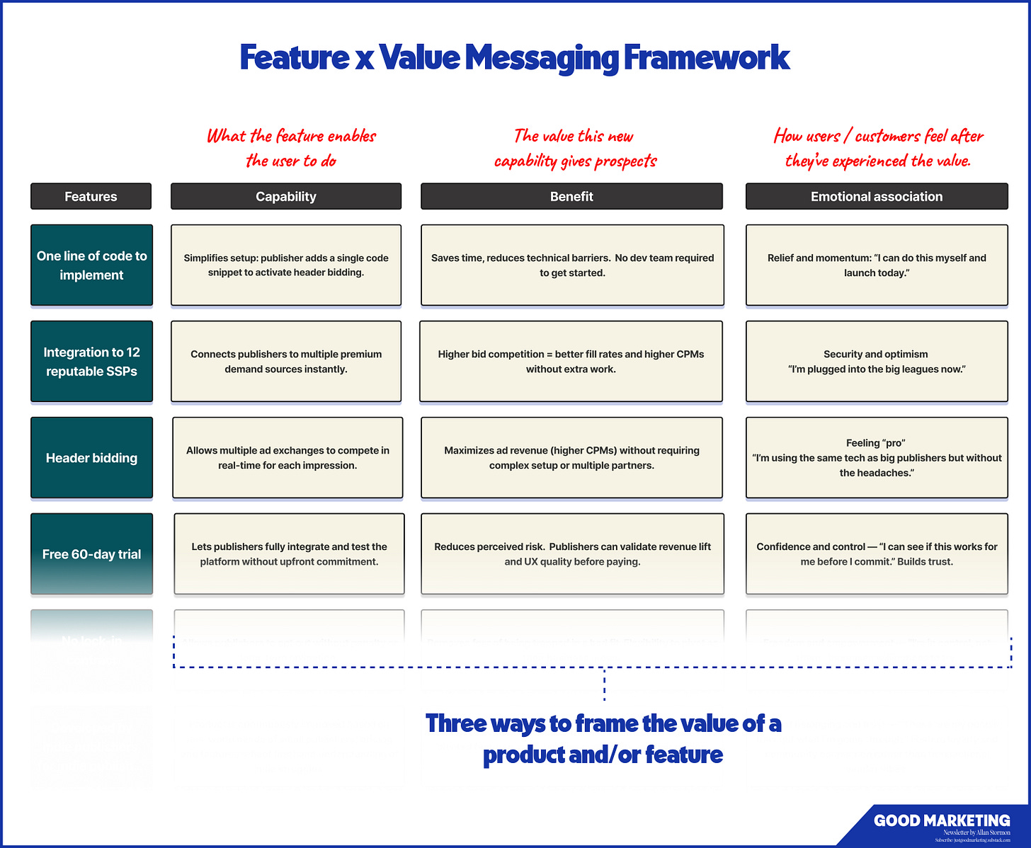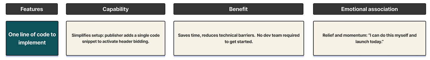 It helps you break down every feature into three levels of value, providing a range of messaging options to use depending on the project you’re working on.