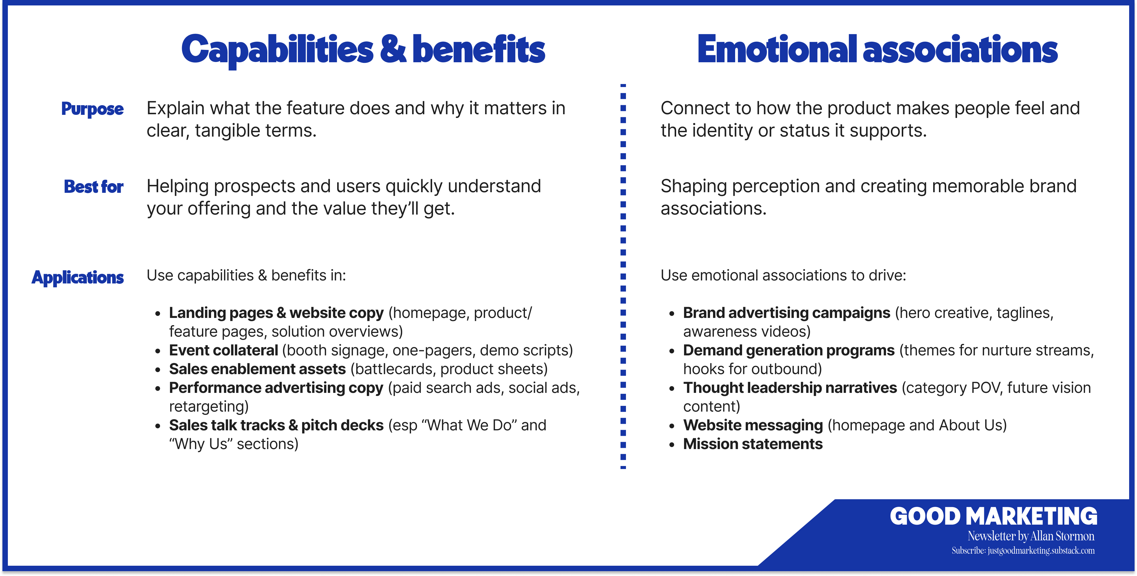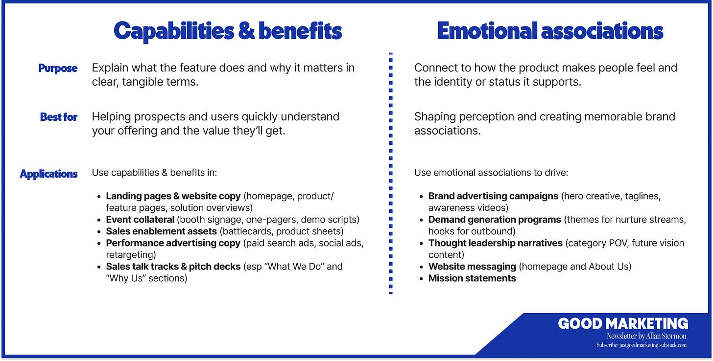 Capabilities and benefits are great for informing landing page copy, website copy, ad creative for performance campaigns or sales enablement materials.