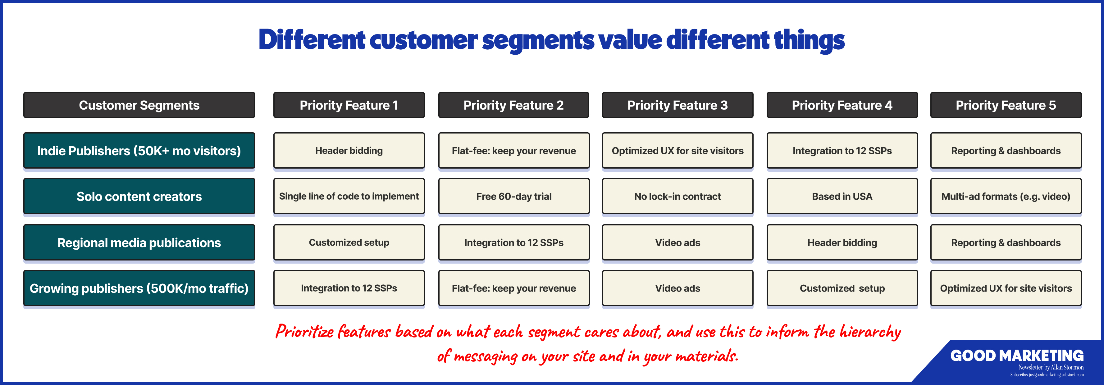 It helps you structure and add hierarchy to features based on the target segment you’re focused on. So, when you’re planning an event, writing a landing page, or developing a campaign theme for a specific audience, you know what features you should focus on and how to frame the value.